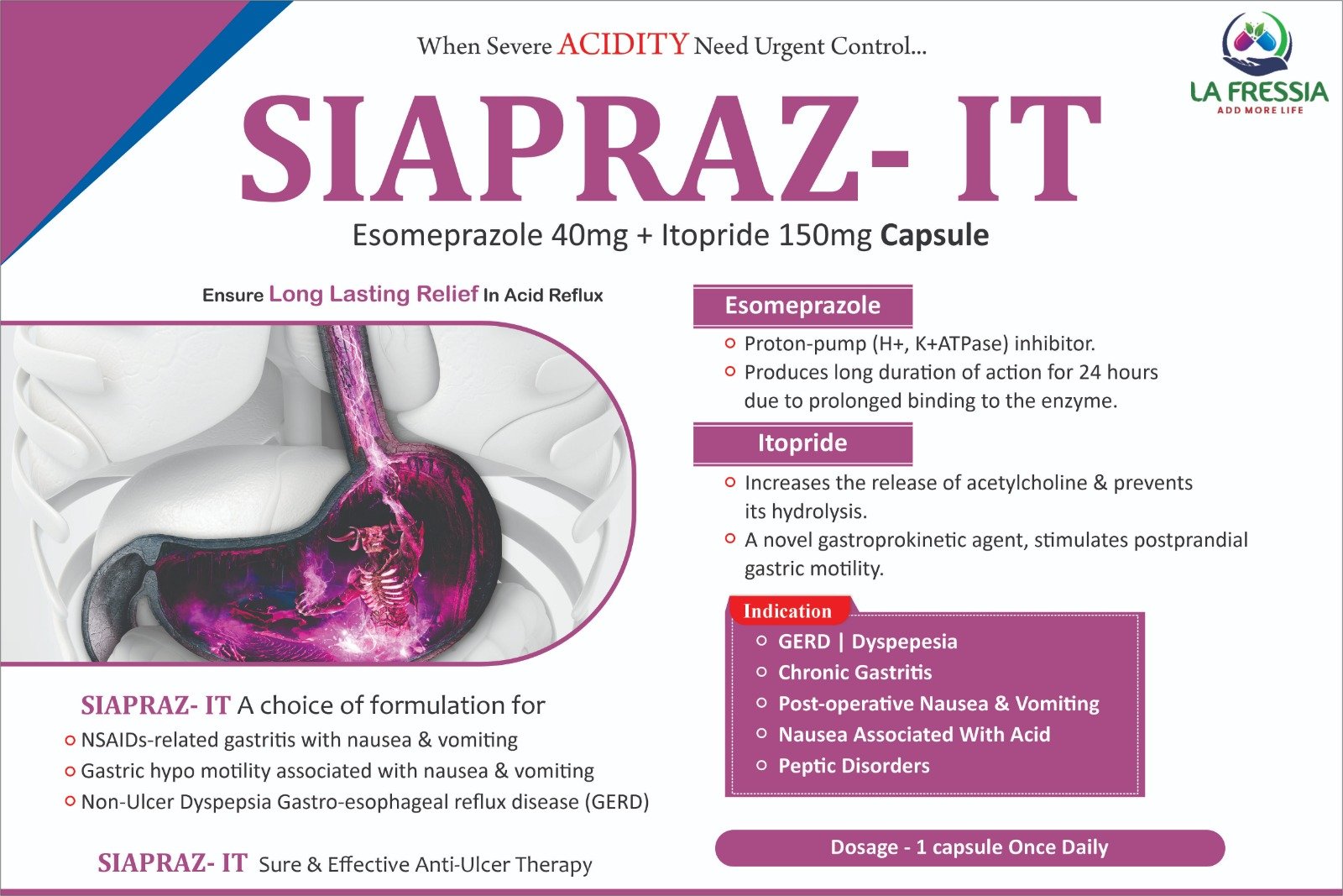 Our Products Page: Our Products Our Products HEPASSIA SACHE Most of the vehicles damage as maintenance neglect. RIBOTHIA TABLES Most of the vehicles damage as maintenance neglect. SIAPRAZ-IT Esomeprazole 40mg + Itopride 150mg Capsule MEBELA Mebeverine HCl 200 mg Capsules LAFARO Faropenem 200 mg / 300 mg Tablets LA SAME S-Adenosyl L-Methionine 400 mg Tablets UDILA 300 / 450 Ursodeoxycholic Acid 300mg / 450mg SR MIDOSSIA Midodrine 2.5mg / 5mg Tablets LA-GLUTA Brand LA Fressia LA FIBRE (Lactitol Monohydrate 10g + Ispaghula Husk 3.5g Granules) RIBOTHIA IV Brand: La Frescia