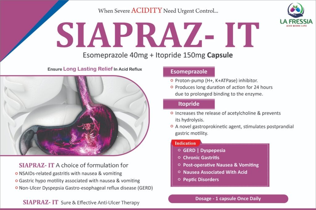 SIAPRAZ-IT combines Esomeprazole, a proton pump inhibitor, and Itopride, a gastroprokinetic agent, to provide long-lasting relief from acid reflux, gastritis, and related GI discomfort. It is specially designed to treat gastric hypo motility and postprandial symptoms associated with acid reflux and indigestion.
